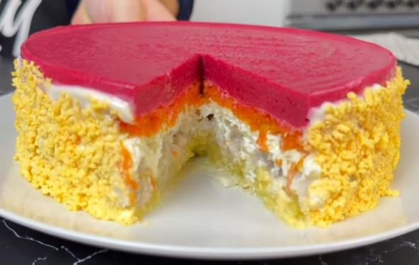 Filete ribe propržite ili skuvajte. Takođe, skuvajte krompir u ljusci, šaragarepu i cveklu. Kada se povrće ohladi, oljuštite i izrendajte. Dok se povrće kuva, crni luk iseckajte i stavite u posudu, pa prelijte vodom, sipajte kašiku sirćeta, kašičicu šećera i soli i promešajte. Ostavite da se luk marinira nekih 15 minuta. Želatin rastvorite u vodi i ostavite da nabubri. Na tacnu stavite obruč i premažite majonezom. Poređajte rendani krompir i lepo utisnite, a zatim posolite i pobiberite, pa ponovo premažite majonezom. Zatim poređajte seckane filete ribe i marinirani crni luk koji ste procedili, pa opet premažite majonezom. Zatim ide sloj rendane šargarepe, pa opet majonez. Pokrijte providnom folijom i stavite u frižider da se malo stegne. Cveklu izblendirajte, pa dodajte kašiku majoneza, kao i želatin koji ste rastvorili na pari. Sve lepo promešajte i sipajte preko salate, pa poravnajte. Ponovo pokrijte providnom folijom i stavite u frižider na 4-5 sati. Krompir izrendajte na sitno rende, pa ga propržite, a onda ivicu novogodišnje salate premažite majonezom i "zalepite" prženi krompir.