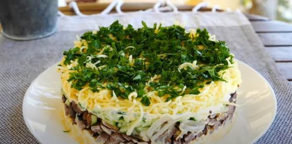 U činiju dodajte iseckan luk, pa prelijte vodom i sirćetom, pa ostavite da odstoji sa strane dok pripremate svečanu salatu. Iseckajte pečurke i stavite u tiganj, pa posolite i pobiberite po ukusu. Dodajte ulje, pa pržite oko 15 minuta dok ne poprime zlatnu boju. Izrendajte kuvana jaja i posolite i pobiberite po ukusu, pa ih pomešajte sa 2 kašike majoneza. Pomešajte proceđen luk i pečurke, pa ostavite smešu da odstoji. Oko tacne stavite pokretnu ivicu, pa rasporedite jaja i majonez kao prvi sloj svečane salate. Iseckajte kuvana pileća srca na kockice i rasporedite kao drugi sloj. Pileća srca pomešajte u kalupu sa kašičicom senfa. Premažite sa manjom količinom majoneza, pa rasporedite beli luk i pečurke. Rasporedite seckani krastavac, pa nanesite 2 kašike majoneza, Rasporedite izrendan tvrdi sir. Odozgo pospite seckani peršun i sklonite pokretnu ivicu oko svečane salate. Preporučujemo i svečanu salatu "Novogodišnji kapriz".