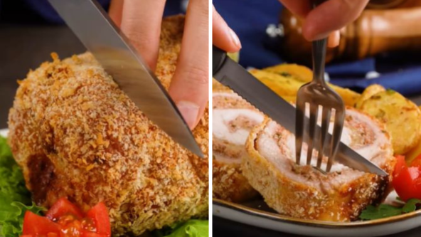 Meso premažite ovom smesom, pa ga prekrijte izrendanim kačkavaljem. Uvijte u rolat. Uvaljajte rolat u brašno, pa u jaja u prezle i pecite u rerni dok se ne ispeče. Uživajte. Možda ćete želeti da napravite i mariniranu svinjsku pečenicu iz rerne.