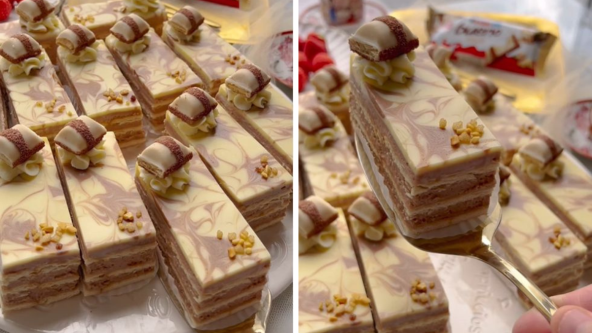 Uzmite keks, umočite ga u mleko i rasporedite preko kalupa obloženog papirom za pečenje. Kašikom prelijte krem od lešnika i ravnomerno rasporedite. Ponovite sa drugim slojem keksa i kašikom rasporedite preostali krem.