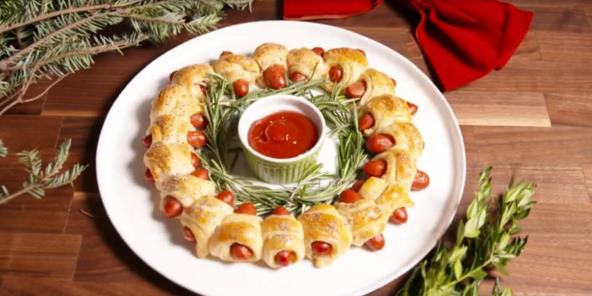 Položite grančice ruzmarina oko unutrašnje strane venca mini rol viršli i stavite malu činiju napunjenu kečapom u centar. Uživajte! Možda ćete želeti da napravite i domaće mini rol viršle.