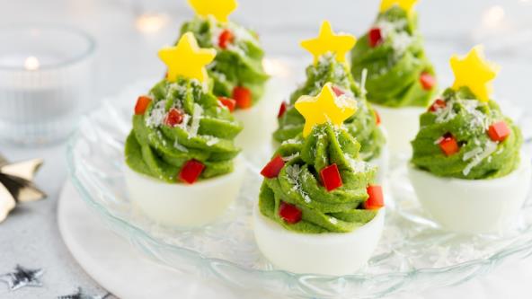 Nežno zelena boja fila, mala zvezda od paprike na vrhu i kremasta tekstura pretvaraju klasično punjeno jaje u najdekorativnije praznično predjelo.