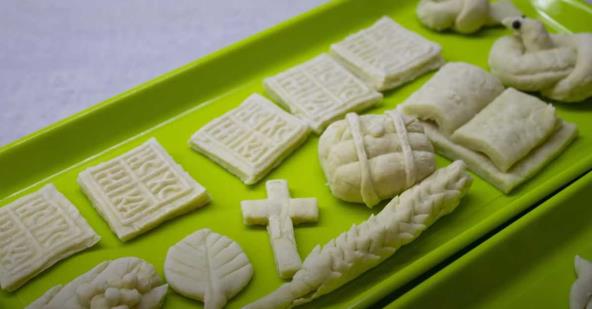 Onda sledi pravljenje krsta, sasvim jednostavno nožem se iseče testo. A onda uz pomoć kalupa u obliku srca pravi se grožđe, pa knjiga za koju će vam biti potrebna samo jedna čačkalica od alata. Potom slede ptica i cveće, burence i na kraju klas žita.