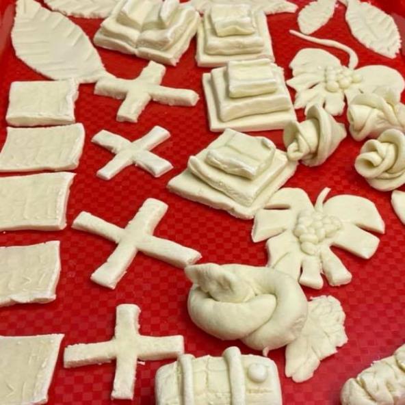 Testo lepo umesiti pa ostaviti pokriveno oko 15 minuta, zatim praviti ukrase. Uz pomoć pečata sa slovima IS HS NI KA možete napraviti jedan oblik, zatim u testu napravite oblik krsta i izrežete.