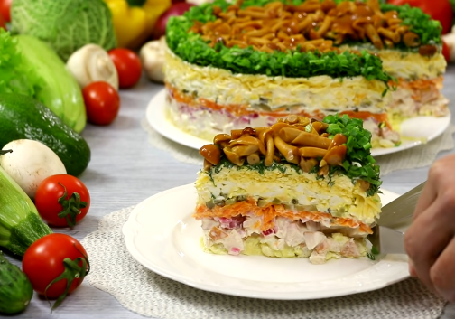 Krompir skuvajte sa korom, pa kada se ohladi oljuštite i izrendajte. Dimljeno pileće meso isecite na kockice, a luk isto isecite, pa prelijte marinadom. Ostavite luk u marinadi 10-15 minuta. Šargapreu i jaja skuvajte, pa izrendajte. Sir takođe izrendajte, a pečurke procedite. Krastavce isecite sitno. U kalup ređajte krompir, majonez, piletinu, majonez, proceđeni luk, majonez, šargarepa, majonez, krastavac, majonez, jaja, majonez, sir, majonez. Pospite seckanom mirođijom, stavite pečurke, po ivici malo majoneza i seckani luk. Ostavite u frižideru da se stegne 2-3 sata.