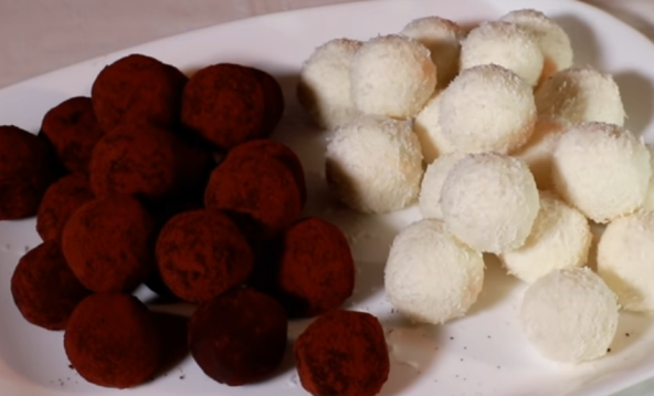 Izmešajte u jednoj posudi sir, kokos i šećer kako biste dobili smesu od koje ćete praviti kuglice. Uvaljajte sve kuglice u kokos, a zatim polovinu u kakao prah, kako biste dobili dve vrste kolače, crne i bele.