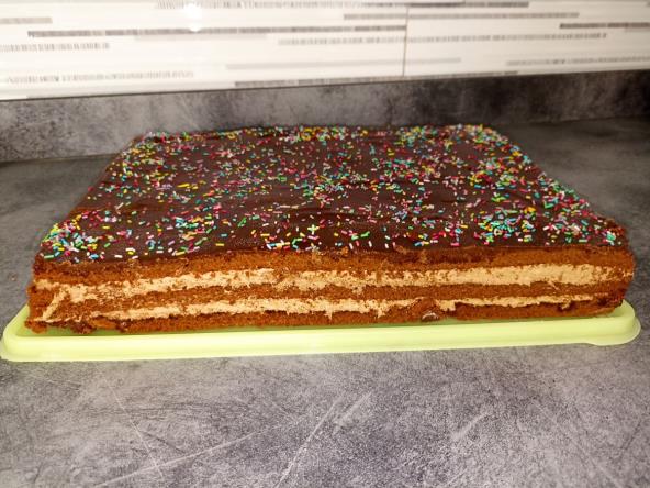 Jednu koru staviti na tacnu i natopiti sokom, pa na koru staviti polovinu fila, pa drugu koru natopiti sokom, pa staviti drugu polovinu fila, pa treću koru i natopiti je. Zatim slatku pavlaku zagrejte dok ne provri, ali nemojte da proključa, a u nju stavite kockice čokolade i mešajte dok se slatka pavlaka i čokolada ne sjedine, pa prelijte na kolač i pospite malo šarenih mrvica. Ostavite u frižideru preko noći da se sve lepo sjedini i onda možete uživati u ukusu!