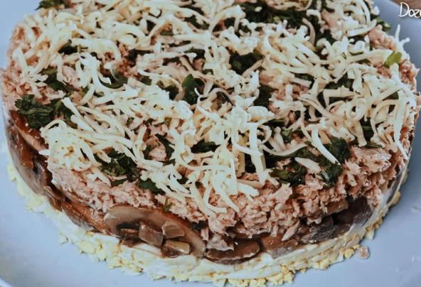 Na ulju propržite sitno seckan crni luk i pečurke, a jaja skuvajte. Uzmite obruč i stavite ga preko tacne, pa poređajte skuvana jaja koja ste prethodno izrendali. Zatim premažite kašikom majoneza, pa poređajte propržene pečurke sa crnim lukom i opet premažite majonezom. Nakon toga tunjevinu procedite i usitnite viljuškom, pa dodajte kašiku majoneza. Dobro promešajte i rasporedite kao treći sloj. Pospite seckanim peršun i rendanim sirom.