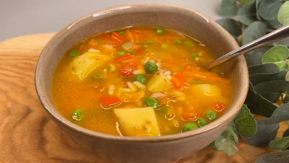 Krompir isecite na kockice i zajedno sa seckanim crnim lukom i rendanom šargarepom stavite da se dinsta na ulju u šerpi. Posolite i promešajte. Pirinač potopite malo u vodi. U šerpu dodajte seckanu papriku i pardajz pa pobiberite, ubacite lovorov list i sipajte litar vode. Dodajte i natopljeni pirinač, promešajte i zagrejte do ključanja. Nakon toga dodajte grašak i tunjevinu i kuvajte još 15 minuta.