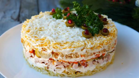 Crni luk iseckajte, pa dodajte kašiku sirćeta, a onda prelijte sirćetom i vodom. Vode treba da bude toliko da prekrije luk, pa ostavite da se marinira nekih 15 minuta. Krompir, jaja i šargarepu skuvajte. Kada se povrće ohladi izrendajte ga, a zatim isecite krastavac i masline, kao i belo meso. Na tacnu stavite obruč i prvi sloj neka bude krompir i poravnajte. Posolite i pobiberite, pa premažite majonezom. Preko stavite marinirani crni luk koji ste procedili. Sledeći sloj je dimljena piletina. Premažite majonezom, pa rasporedite kisele krastavce. Poređajte i šargarepu, a onda premažite majonezom. Solite kada mislite da je potrebno. Pospite rendanim sirom, premažite majonezom, a zatim pospite jajima. Pokrijte providnom folijom i ostavite u frižideru 4 sata. Ukrasite peršunom, maslinama i narom.