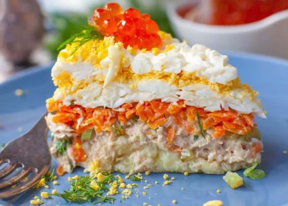 Skuvajte krompir sa ljuskom i šargarepu koju ste prethodno oljuštili. Ostavite da se povrće ohladi, pa izrendajte, ali prvo skinite ljusku sa krompira. Jaja takođe skuvajte, pa odvojite belanca i žumanca i izrendajte. Stavite u posebne činije, a u treću dodajte rendani sir i rendana belanca i dodajte dve kašike majoneza i jednu kašiku mirođje, pa sjedinite. Krompir dodajte dve kašike majoneza, kao i jednu kašiku seckane mirođije. Začinite po želji i dobro sjedinite. U posudu sa šargarepom dodajte jednu kašiku majoneza i začine, pa lepo sjedinite. U četvrtu posudu stavite tunjevinu koju ste procedili, pa dodajte 3 kašike majoneza, jednu kašiku seckane mirođije i 2 seckana mlada luka. Posolite i pobiberite i sve lepo promešajte. Za ređanje salate koristite kalup za torte sa obručom koji može da se skine. Premažite kalup uljem i prvo poređajte krompir i lepo poravnajte. Zatim poređajte smesu sa tunjevinom, a onda pospite kisele krastavce i preostala 2 mlada luka koji ste iseckali. Posle toga ide sloj šargarepe, a zatim i rendani sir sa belancima. Pospite žumancima, pa premažite majonezom i pokrijte providnom folijom, pa ostavite u frižideru sat vremena, a najbolje preko noći. Ujutru ukrasite preostalim žumancima.