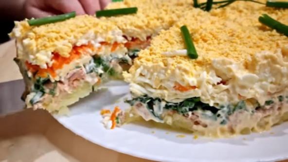 Na tacnu stavite obruč za kolače. Skuvajte krompir u ljusci, pa procedite. Kada se ohladi, skinite koru i izrendajte. Utisnite krompir u kalup koji ste pripremili, pa premažite majonezom. Zatim poređajte tunjevinu koju ste procedili, a onda i seckani mladi luk. Premažite majonezom, pa poređajte renadni sir. Premažite majonezom, pa izrendajte šargarepu koju ste prethodno skuvali. Premažite majonezom i pospite rendanim sirom (50 g), ali ovaj put izrendajte na sitno rende. Vaša svečana slavska salata je spremna.