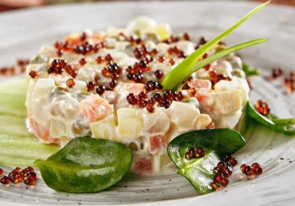 Prema legendi, čuveni kuvar Lucijen Olivie, originalnu rusku salatu pravio je sa rakovima, a kasnije ih je zamenio kavijarom. Možda vam deluje kako će morski plodovi samo uništiti savršen ukus ruske salate, ali ovo je idealan recept za posnu verziju. Kavijar je dosta skup, pa ne morate da eksperimentišete sa njim, ali vam rakove ili losos preporučujemo, jer je salata neverovatno ukusna. Takođe, dodajte i seckane lešnike, jer je prema legendi kuvar i njih dodavao u salatu.