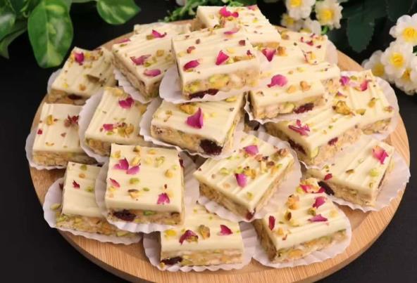 Pistaće i keks krupnije izblendirajte, pa pomešajte u posudi. Dodajte brusnice i čokoladu (250 g) koju ste istopili sa slatkom pavlakom, pa pomešajte rukama. Smesu za sitne kolače utisnite u tepsiju koju ste obložili pek papirom. Pokrijte i stavite u frižider na pola sata. Istopite belu čokoladu (200 g) i prelijte preko podloge od keksa. Ostavite u frižideru još 10 minuta da se stegne. Dekorišite preostalom istopljenom čokoladom, seckanim pistaćima i laticama ruže. Isecite na kocke i služite ove sitne kolače na slavskoj trpezi.