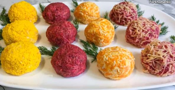 Cveklu skuvajte, pa izrendajte. Šargarepu isto skuvajte, ali da ne bude skroz mekana. Izrendajte i šargarepu, a filet ribe ispržite i iseckajte na sitne kockice. U jednoj posudi pomešajte cveklu, 75 g rendanog sira, 3 kašike majoneza i mleveni beli luk. Sve dobro sjedinite, pa uzimite malo smese, oblikujte lopticu, pa rukama spljoštite i stavite malo ribe unutra. Ponovo oblikujte loptice. U drugoj posudi pomešajte šargarepu, 75 g rendanog sira, 3 kašike majoneza i mleveni beli luk. Oblikujte loptice punjene ribom na isti način kao sa prethodnom smesom. Poređajte na tacnu i stavite u frižider na 15 minuta. Odvojite nekoliko loptica i uvaljajte u rendani sir, a par možete u smesu sa začinima. Neke loptice ostavite kakve i jesu. Slavsko predjelo za Svetog Nikolu je spremno.