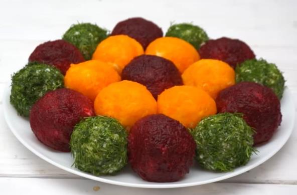 Podelite loptice na 3 jednaka dela i uvaljajte zasebno u mirođiju, cveklu i šargarepu. Poslužite hladno predjelo za slavu.