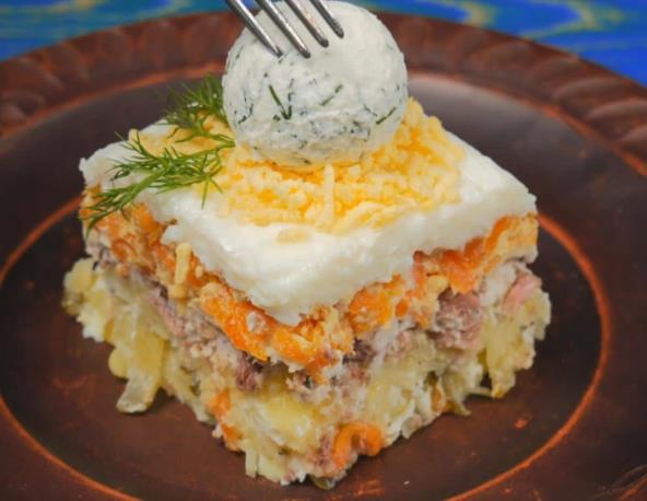Tepsiju za hleb obložite providnom folijom, pa sipajte smesu sa belancima i poravnajte. Premažite smesom sa sirom. Preko poređajte smesu sa šargarepom i žumancima. Premažite smesom sa sirom. Sledeći sloj je praška šunka koju ste procedili i izdrobili viljuškom. Premažite smesom sa sirom, a onda poređajte sloj rendanog krompira, pa preko premažite smesu sa sirom. Zatim idu rendani kiseli krastavci, pa još jedan sloj smese sa sirom. Još jedan sloj krompira i na kraju premažite smesom sa sirom.