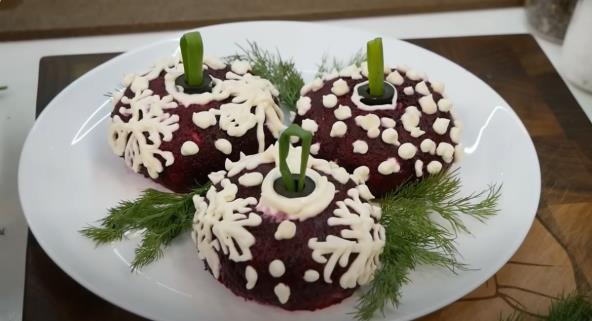 Pažljivo izvadite loptice koje ste napravili, na tanjir. Ukrasite maslinama i u njih ubacite savijene listiće luka. Ukrastie majonezom. Uživajte u svečanoj salati od haringe i kuvane repe!