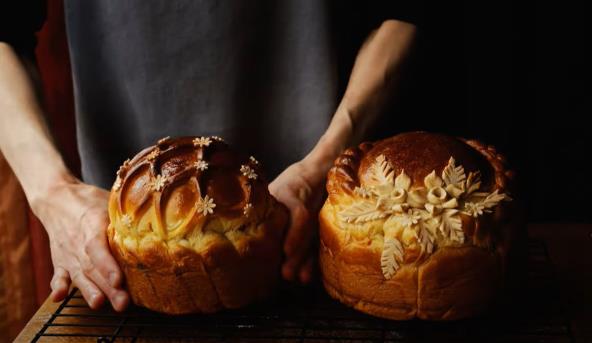 Zagrejte rernu na 170ºC. Premažite klače jajetom razmućenim sa mlekom. Pažljivo stavite ukrase na kolače. Pecite, stavljajući kalupe za pečenje na drugu rešetku odozo. Kolač od prečnika 15 cm se peče 35 minuta, a kolač prečnika 18 cm, 45 minuta. Nakon privih 20-22 minuta, prekrijte ih aluminijumskom folijom da ne bi previše porumeneli. Izvadite, ostavite da odstoje 5 minuta u plehu, skinite potom kalupe i ostavite da se potpuno ohlade na rešetki. Možda ćete želeti i recept za slavski kolač koji može da napravi i početnik.