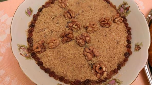 Prebacite žito u dublju činiju, poravnajte površinu i pospite mlevenim orasima.
