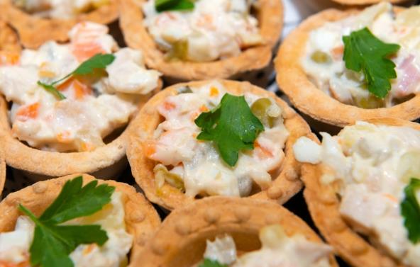 Sve sastojke izmešajte u činiji i napunite korpice. Ukrasite listićem peršuna ili maslinkom.