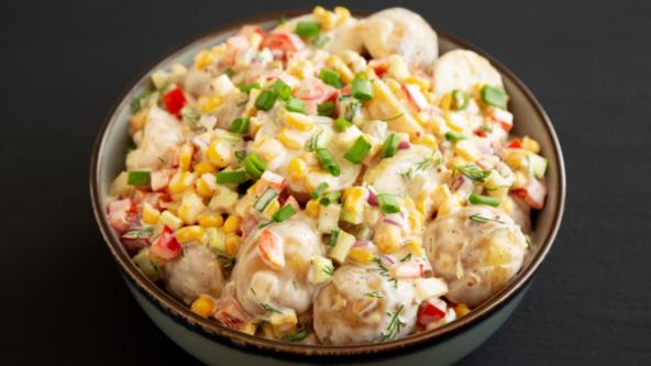 U veliku činiju stavite ohlađen krompir, dodajte iseckane krastavčiće, papriku, praziluk i kukuruz. Prelijte pripremljenim dresingom i nežno promešajte da se sve ravnomerno poveže.