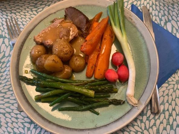 Priprema: Stavite jagnjetinu u dublji pleh, pa je zasecite na nekoliko mesta i špikujte belim lukom. Začine pomešajte i protrljajte jagnjetinu sa obe strane. Zatim sa uljem ponovo premažite jagnjetinu. U pleh sa mesom sipajte vodu i prekrijte folijom. Pecite na 200°C sat i po, možda i jače, meso treba da bude mekano. U toku pečenja morate okretati jagnjetinu, a ako je ostalo bez vode dodati je. Desetak minuta pred kraj skinite foliju da meso dobije koricu. Posle sat vremena ubacite mladi krompir isečen na polutke i šargarepu. Uvek vraćajte foliju sem pred kraj pečenja. Šparglu obarite, a zelenu boraniju blanširajte, pa propržite na puteru sa belim lukom.