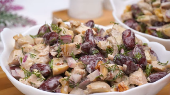 Salata sa piletinom i pasuljem je bogata proteinima, vitaminima i mineralima. Umesto majoneza možete da koristite i grčki jogurt, a svečana trpeza će postati nezamisliva bez nje. Neočekivano dobra kombinacija sastojaka, a možete je jesti i za večeru.