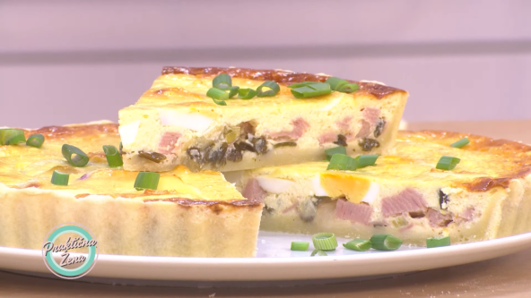 Propržite seckani mladi luk. U posudi sjedinite brašno, so, izmrvljeni puter i hladnu vodu. Umesite testo, pa razvucite krug i stavite u tepsiju za tart. Lepo prstima razvucite. Proprženi luk sjedinite sa seckanom šunkom. Sipajte preko testa, pa poređajte kuvana jaja koja ste isekli na kolutove. Umutite jaja sa pavlakom, mlekom i parmezanom, pa prelijte kiš. Pecite u zagrejanoj rerni na 180°C oko 30 minuta.