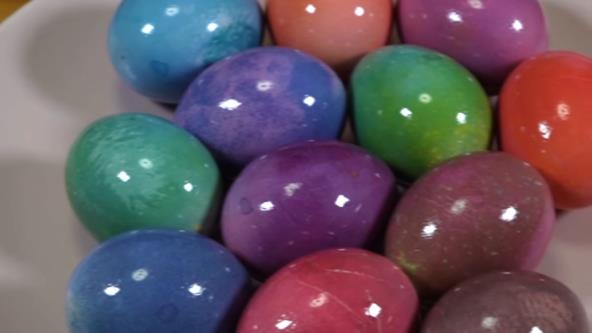 Jaja skuvajte, a na sto poređajte nekoliko posuda. U svaku sipajte boju i vodu, pa promešajte. Dodajte u svaku posudu po dve kašike sirćeta i kašiku ulja. Promešajte, a jaje uvljajte prvo u jednu boju, a onda i u drugu. Kombinacije pravite po želji.