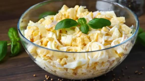 Kukuruz i jaja skuvajte. Šunku iseckajte, a celer izrendajte. U posudi pomešajte jaja koja ste sitno iseckali, kukuruz, šunku, iseckani ananas i celer. Dodajte jogurt i majonez, pa posolite i pobiberite. Sve dobro promešajte.