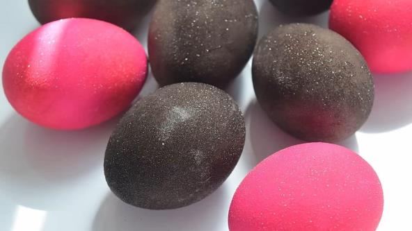 Jaja kuvana u vinu su tamnoljubičaste boje, a ako ste ostavili da odostoje koliko treba, pojaviće se i šljokice. Odložite jaja u korpu.
