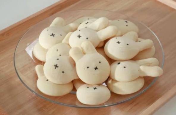 Na pleh stavite pek papir, pa istisnite krugove od testa (sa razmakom). Zatim na svakom krugu iscrtajte uši i popunite ih testo. Mokrim prstom pritisnite vrhove, kako biste zagladili keks.