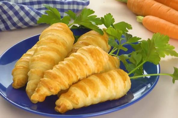 Lisnato testo odmrznite, pa malo oklagijom razvucite. Isecite na tanke trake. Svaku šargarepu oljuštite, pa obmotajte traku od testa oko šargarepe. Poređajte na pleh obložen pek papirom, pa premažite umućenim jajetom. Pecite u zagrejanoj rerni na 200°C oko 15 minuta.