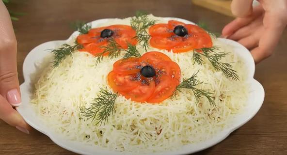 Ponovo nanesite majonez u obliku mrežice. Stavite paradajz isečen na komade, prethodno ocedite višak tečnosti iz njih. Na isti način ih ravnomerno rasporedite po salati. Stavite seckani luk na paradajz, a zatim prelijte majonezom. Odozgo i sa strane pospite salatu rendanim kačkavaljem. Uzmite 3 čeri paradajza i isecite ih na tanke krugove. Rasporedite ih odozgo na salati da izgledaju kao cvetovi maka. Za jedan cvet je potrebno 6 krugova. Na ovaj način rasporedite 3 cveta. U sredinu svakog cveta stavite trećinu masline, kao centar maka. Oko centra pospite paradajz zrnima maka. Svaki cvet ukrasite grančicama mirođije. Uživajte! Možda ćete želeti da napravite i najlepšu prolećnu salatu sa kupusom i kukuruzom.