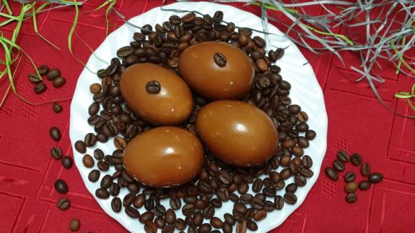 Jaja pažljivo operite i ostavite da se osuše. U šerpu sipajte vodu, dodajte mlevenu kafu i stavite da provri. Kada voda proključa, smanjite vatru i ubacite jaja. Dodajte sirće (pomaže boji da se bolje "zakači"). Kuvajte jaja 10–12 minuta zajedno s kafom.