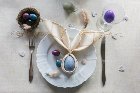 Raširite salvetu na sto tako da bude u obliku kvadrata. Presavijte je dijagonalno da dobijete trougao. Urolajte salvetu počevši od šire strane trougla prema vrhu, kao da pravite tanku traku. Savijte traku u oblik slova “U”, tako da krajevi (uši) budu gore, a sredina dole. Stavite jaje u sredinu donjeg dela savijene salvete. Zavežite trakicu ili kanap odmah iznad jajeta, tako da učvrstite "uši" i napravite oblik zeca. Raširite krajeve salvete malo da podsećaju na zečije uši.