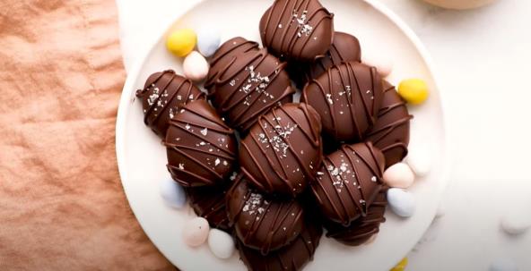 Ohladite praline u obliku jaja u frižideru najmanje 1 sat, do 1 dan. Tokom poslednjih nekoliko minuta vremena hlađenja, počnite da topite čokoladu i ulje zajedno, na pari. Ostavite toplu čokoladu da odstoji 6-8 minuta da se malo ohladi. Izvadite praline iz frižidera i jednu po jednu potapajte u čokoladu, a zatim pažljivo izvadite viljuškom. Nežno tapkajte viljuškom o bočnu stranu posude, da biste uklonili višak čokolade.