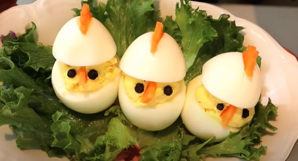 Kako biste napravili jaja na ovaj način, prvo tvrdo skuvajte jaja. Kada se ohlade, isecite donji deo jajeta, tek toliko da može da stoji uspravno. Zatim isecite jaje skoro na pola, malo više ka vrhu. Uradite tako sa svakim jajetom pa ih izdubite i izvadite žumanca na tanjir.