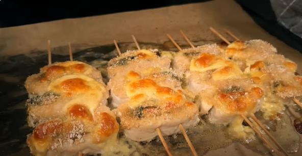 Nakon što ga urolate, isecite ga na kriške debljine 2 cm. Zatim na svaki štapić bočno nabodite po tri rolata. Po potrebi probodite sa dva štapića. U plitkoj činiji umutite viljuškom jedno jaje umočite rolate u jaje pa u prezle. Poređajte ih na pleh sa papirom za pečenje. Pecite u rerni zagrejanoj na 180 stepeni oko 45 minuta. Servirajte i uživajte. Možda ćete želeti da napravite i riblje rolnice sa sirom i začinskim biljem.