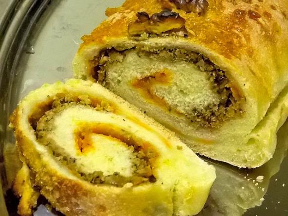 Za to vreme narendati očišćenu bundevu na krupno rende, dodati rendanu koru pomorandže i šećer i sve promešati.Nadošlo testo premesite i razvijte koru u obliku pavougaonika. Rasporedite bundevu, preko bundeve pospite mlevene orahe i savijajte koru u obliku rolata.Pleh obložite pek papirom, postavite pripremljen rolat-štrudlu u pleh. pored štrudle možete poredjati nekoliko komada bundeve posute smedjim šećerom.