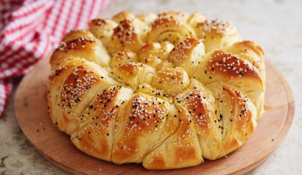 4. Od četvrtog dela razvucite koru, isecite je na trakice, od kojih ćete napraviti listiće (pogledajte fotografije, da se bolje orijentišete). Ostavite da nadođe 40 minuta, namažite trećim jajetom, pospite semenkama po izboru. Pecite na 200 stepeni dok ne bude gotova