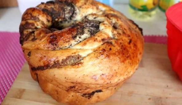 Zatim uviti u štrudlu u staviti u podmazan kuglof. Ostaviti da poraste oko 15 min premazati žumancetom i peći na 200 stepeni C oko 50 min.