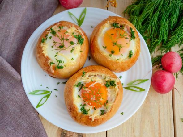 4. Stavite zemičke u prethodno zagrejanu rernu i pecite 10-15 minuta dok se jaja i hleb ne zapeku.