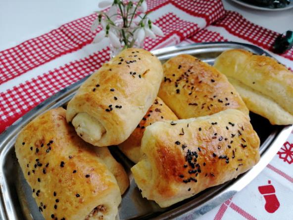 Iseći na pravougaonike puniti sirom ili orasima. Uvijati i ređati u podmazan pleh. Pokriti i ostaviti da rolnice malo nadođu.