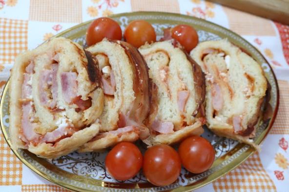 Na sto poređati jedno do duge listove slanine, pa odozgo staviti rolnicu pice i uviti slaninu oko rolnice.