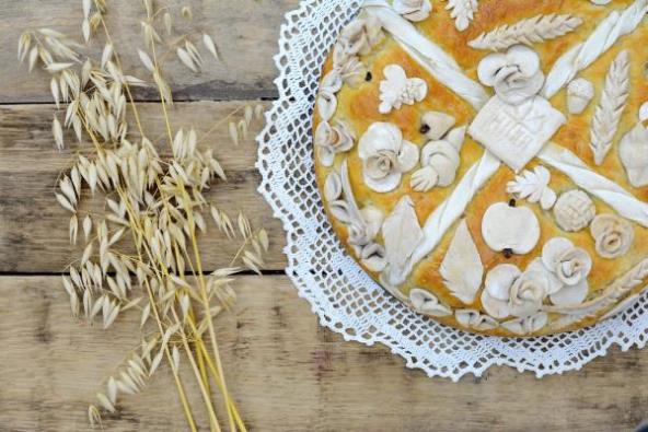 Ostavite pogaču da naraste, pa je premažite žumancetom, mlekom i uljem. Pecite na 160 stepeni oko 40 minuta