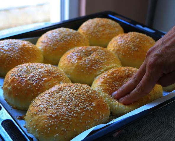 Izmešajte jaje sa maslacem, dodajte vodu i nadošli kvasac. Zamesite testo, dobro ga izradite i ostavite 30 minuta. Podelite na manje jednake delove i napravite loptice. Ređajte na podmazanu tepsiju, prekrijte folijom ili kesom za zamrzivač, krpom i ostavite da stoje sat vremena. Premažite umućenim jajetom i mlekom, pospite susamom i pecite oko 20 minuta na 200 stepeni. Možete staviti na dno rerne manju tepsiju ili posudu sa vodom da isparava dok se pogačice peku.