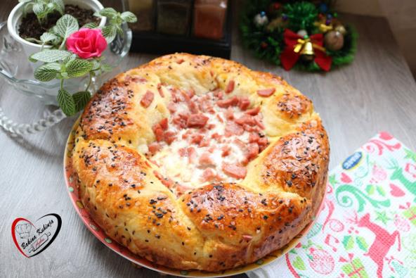 U posudu sipati brašno, dodati nadošli kvasac sa šećerom, jaje, ulje, mleko, so i zamesiti mekše testo. Pokriti da odmori 20 min. Tepsiju podmazati ili staviti pek papir i istresti u nju testo. Masnim rukama pritisnuti da oblikuje tepsiju (26 cm). Na sredinu staviti umućenu pavlaku, sir i belance i razvući na sredini. Odozgo naseckati šunku. Testo odvajati od ivice tepsije presavijati ga i spajati kao u VIDEU. Premazati testo u krug žumancetom i posuti semenkama i solju. Ostaviti da odmori 10 minuta. Za to vreme ugrejati rernu na 200°C i peći oko 40 min. pogaču. Kada se ispeče pokriti je 20 minuta da odmori i seći.