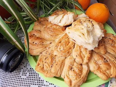 Svaku lopticu razviti na veličinu pleha pa je premazati maslacem. Na sredinu staviti manji tanjir. Nožem do tanjira seći po tri trake, srednju uviti oko ose a sa dve sa strane u"ušukati" uvijenu traku i tako u krug.